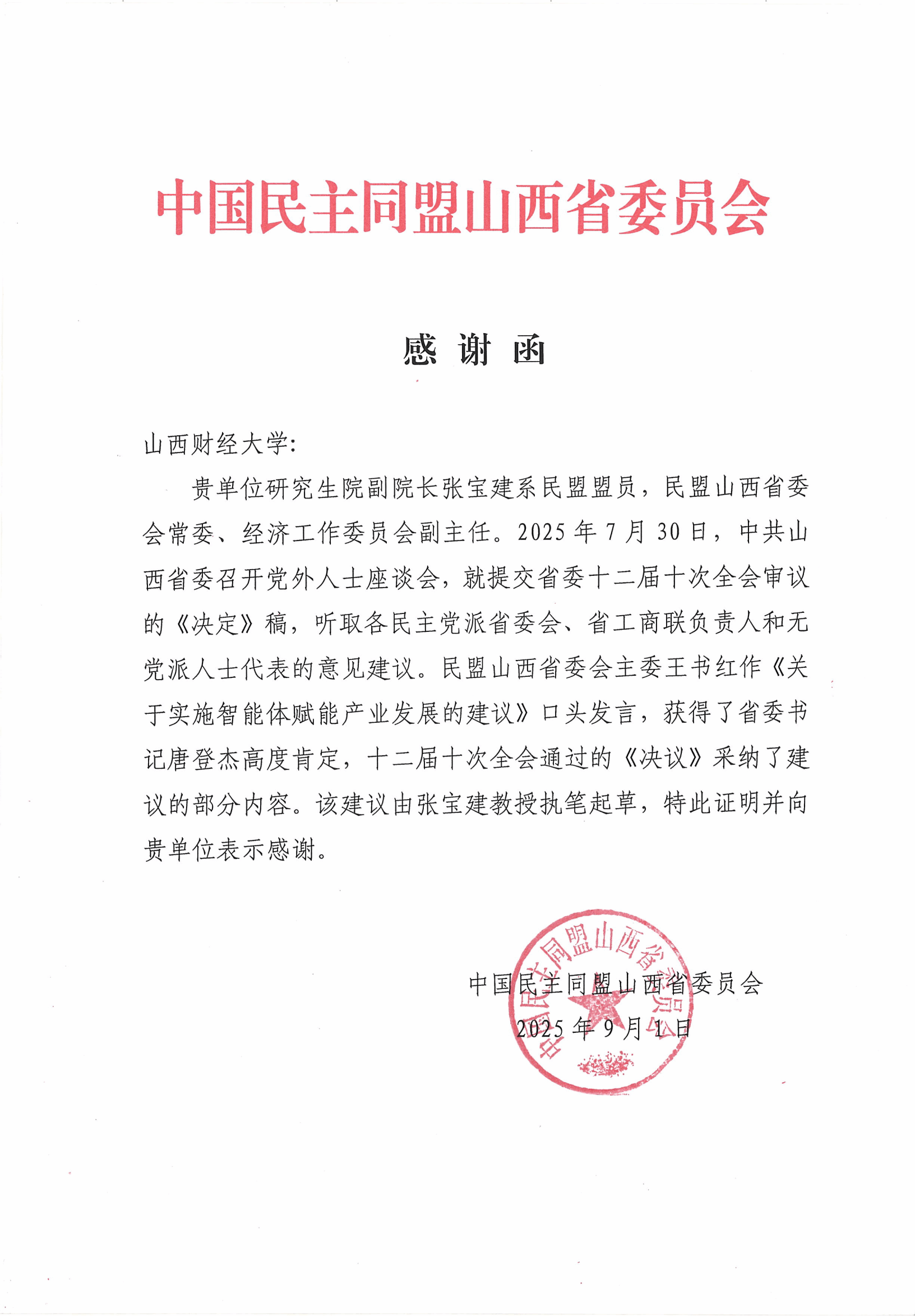 近日,山西财经大学统战工作再传捷报,我校统战成员在政策建言与服务国际活动两大领域均取得亮眼成绩,先后获民盟山西省委、山西省委统战部致函表扬,充分展现了我校统战工作的扎实成效与统战成员的过硬素质。
