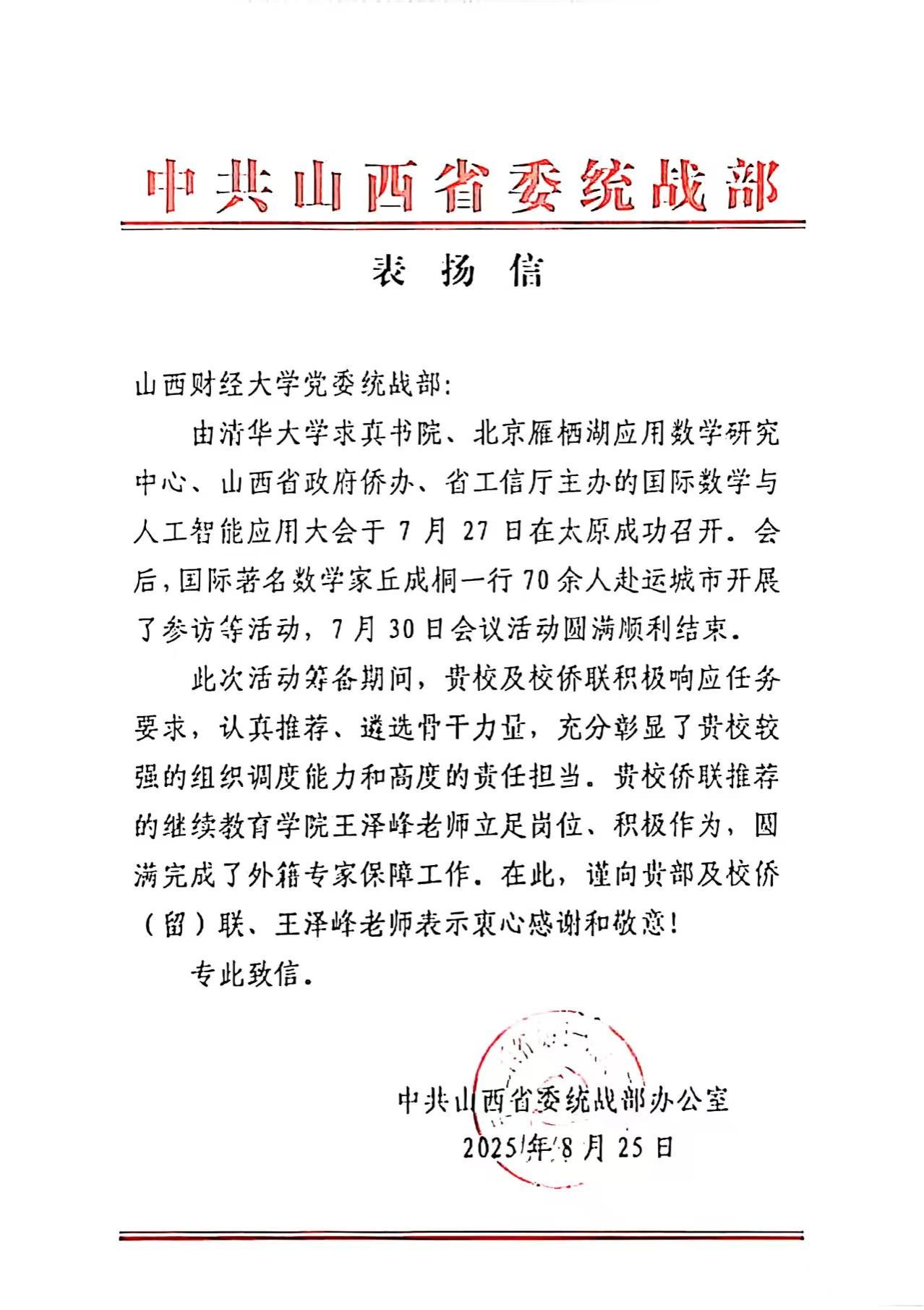 在此前由山西省政府侨办、山西省工信厅举办的2025国际数学与人工智能应用大会上,我校侨留联理事,民建会员王泽峰,受学校选派参与大会保障工作。大会汇聚了包括菲尔兹奖得主丘成桐、诺贝尔经济学奖得主安德烈·奥昆科夫等在内的全球数十位世界级数学与人工智能领域专家学者,会议保障工作标准高、任务重。与会期间,王泽峰老师立足岗位、积极作为,以“零差错”的工作标准,圆满完成了对外籍专家的服务保障工作。其专业的工作能力与严谨的服务态度,赢得了丘成桐、安德烈·奥昆科夫等国际顶尖专家的一致赞誉,为大会的成功举办贡献了山财力量,彰显了山财实力。